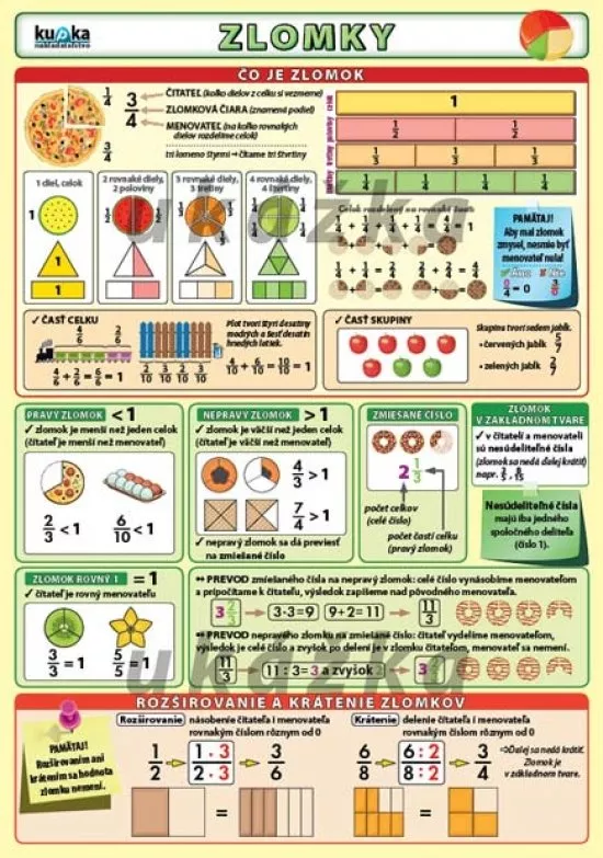 Prehľadne spracovaná a bohato ilustrovaná téma zlomkov. Obsahuje základné rozdelenie zlomkov, rozširovanie a krátenie zlomkov, porovnávanie zlomkov a matematické operácie so zlomkami.