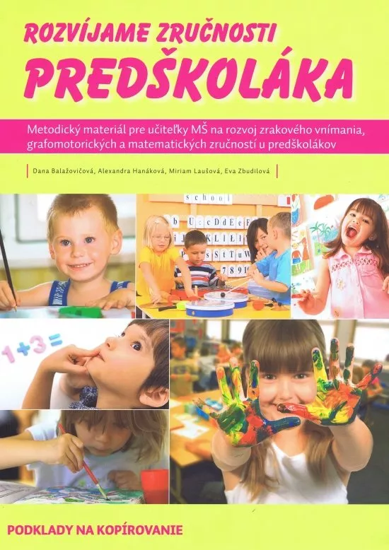 Publikácia – metodický materiál Rozvíjame zručnosti predškoláka s podnadpisom Metodický materiál pre učiteľky MŠ na rozvoj zrakového vnímania, grafomotorických a matematických zručností u predškolákov (podklady na kopírovanie) oboznamuje učiteľky v materských školách s kritériami školskej spôsobilosti a s požiadavkami, ktoré by malo dieťa pri nástupe do základnej školy spĺňať. Teoretická časť sa venuje kritériám nástupu dieťaťa do základnej školy: veku, telesnej, psychickej, pracovnej, sociálnej a emocionálnej spôsobilosti. Praktická časť obsahuje 100 pracovných listov, ktoré slúžia na rozvoj grafomotorických a matematických zručností a zrakového vnímania. Pracovné listy sú logicky označené: * GZ – pracovné listy na rozvoj grafomotorických zručností – zamerané na precvičenie grafomotoriky, vizuálno-motorickej koordinácie a zmyslového vnímania, * MZ – pracovné listy na rozvoj matematických zručností – zamerané na podporu rozvoja priestorovej orientácie, rozoznávania farieb a geometrických tvarov, * ZV – pracovné listy na rozvoj zrakového vnímania – zamerané na zrakovú diferenciáciu, zrakovú analýzu a syntézu a rozlišovanie reverzných figúr. Obsah: I. Teoretická časť - Školská spôsobilosť 1. Vek 2. Telesná spôsobilosť 3. Psychická spôsobilosť 3.1 Zrelosť kognitívnych funkcií 3.1.1 Vnímanie 3.1.2 Pamäť a myslenie 3.1.3 Pozornosť 3.1.4 Reč 3.1.5 Grafomotorika a kresba 4. Pracovná spôsobilosť 5. Sociálna a emocionálna spôsobilosť 6. Školská nespôsobilosť 7. Individuálne psychologické vyšetrenie školskej spôsobilosti II. Pracovné listy 1. Rozvoj grafomotorických zručností (GZ) 2. Rozvoj matematických zručností (MZ) 3. Zrakové vnímanie (ZV)