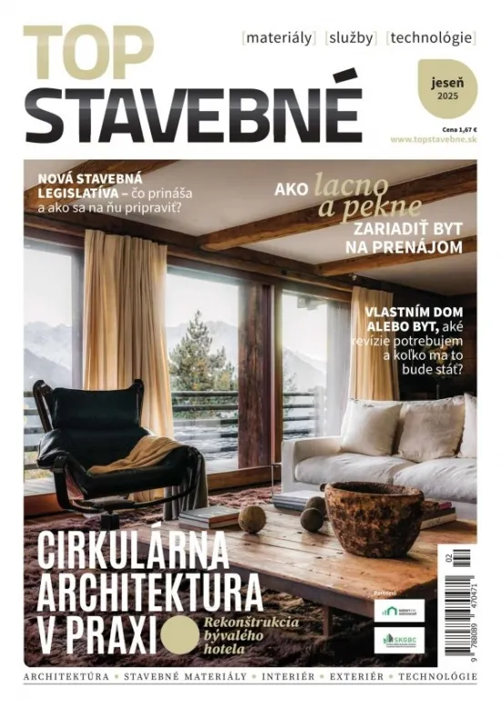 Prinášame vám pohľad na najdôležitejšie zmeny v stavebnej legislatíve. Ukážeme, ako štýlovo a pritom úsporne zariadiť byt na prenájom a poradíme, aké revízie sú nevyhnutné pre vlastníkov bytov a domov. V hlavnej téme sa pozrieme na cirkulárnu architektúru v praxi – na príklade rekonštrukcie bývalého hotela.